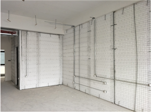 4、 在鋼絲網(wǎng)架防火聚苯板的一側(cè)澆注勻質(zhì)防火保溫材料